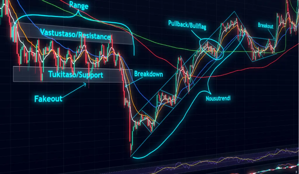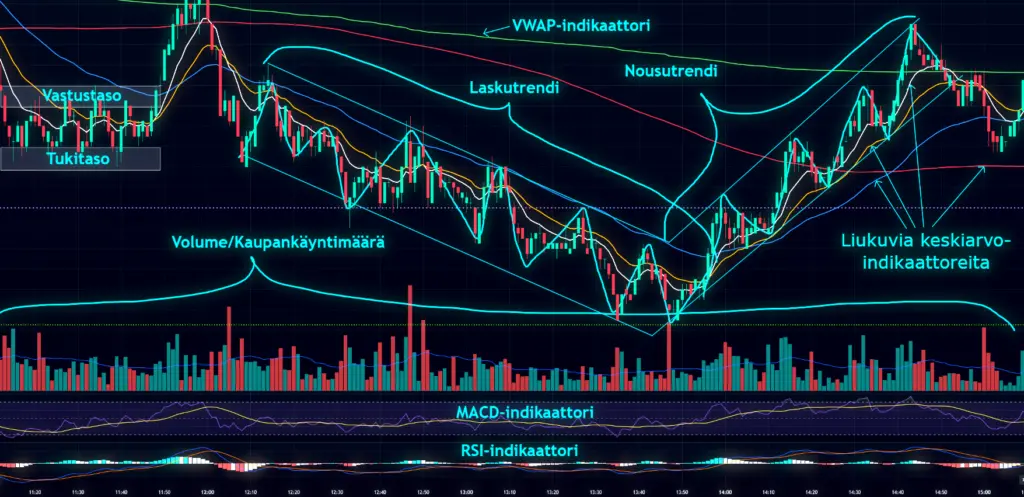 Indikaattorit: Teknisessä analyysissä voidaan hyödyntää indikaattoreita auttamaan hintaliikkeiden arvioimisessa ja antamaan osto- ja myyntisignaaleita.