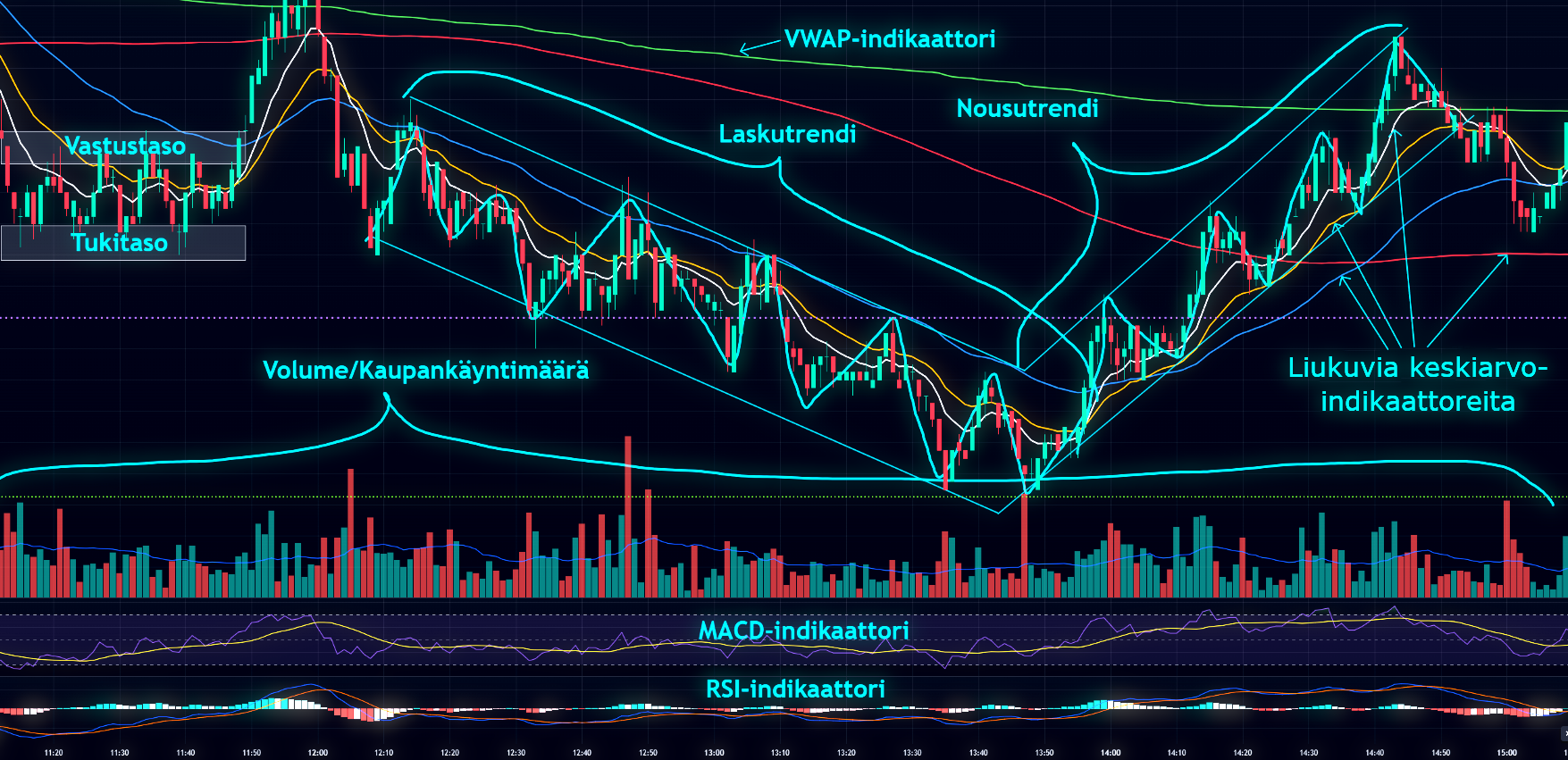 Tuki- ja vastustasot: Hintaliikkeistä pystytään löytämään erilaisia tasoja, joista hinta ei suostu nousemaan ylös tai laskemaan alas.