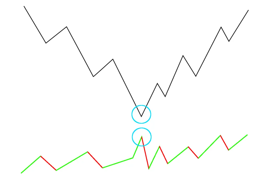 Trendin käännöksessä ja päättymisessä voi usein havaita volumepiikin, jolloin on mahdollista, että trendi tai impulssi on tullut päätökseen. Tällöin optimaalisesti volumepalkki on selkeästi korkeampi kuin edeltävät volumepalkit. Optimaalisesti seuraavan kynttilänkin volume on melko suurta.