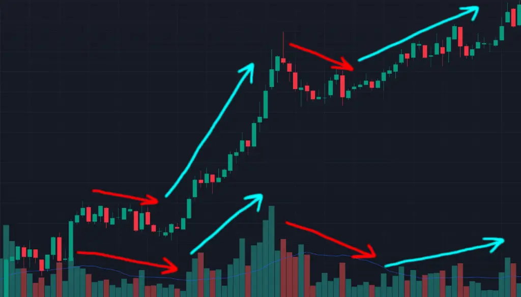 Kun volume alkaa nousemaan trendissä pullbackin pohjalla tai aikana, tämä voi kertoa uuden impulssin alkamisesta ja toimii hyvänä ostopaikkana. Alas päin kulkevassa trendissä volume toimii optimaalisesti tismalleen samalla tavalla. Alaspäin menevässä trendissä hinta laskee, volume nousee. Kun hinnan lasku keskeytyy ja pullback alkaa, volume alkaa laskemaan.